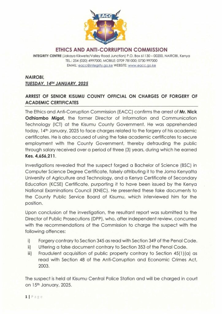 The Ethics and Anti-Corruption Commission (EACC) has arrested Mr. Nick Odhiambo Migot, the former Director of Information and Communication Technology (ICT) at Kisumu County Government, for alleged forgery of academic credentials.