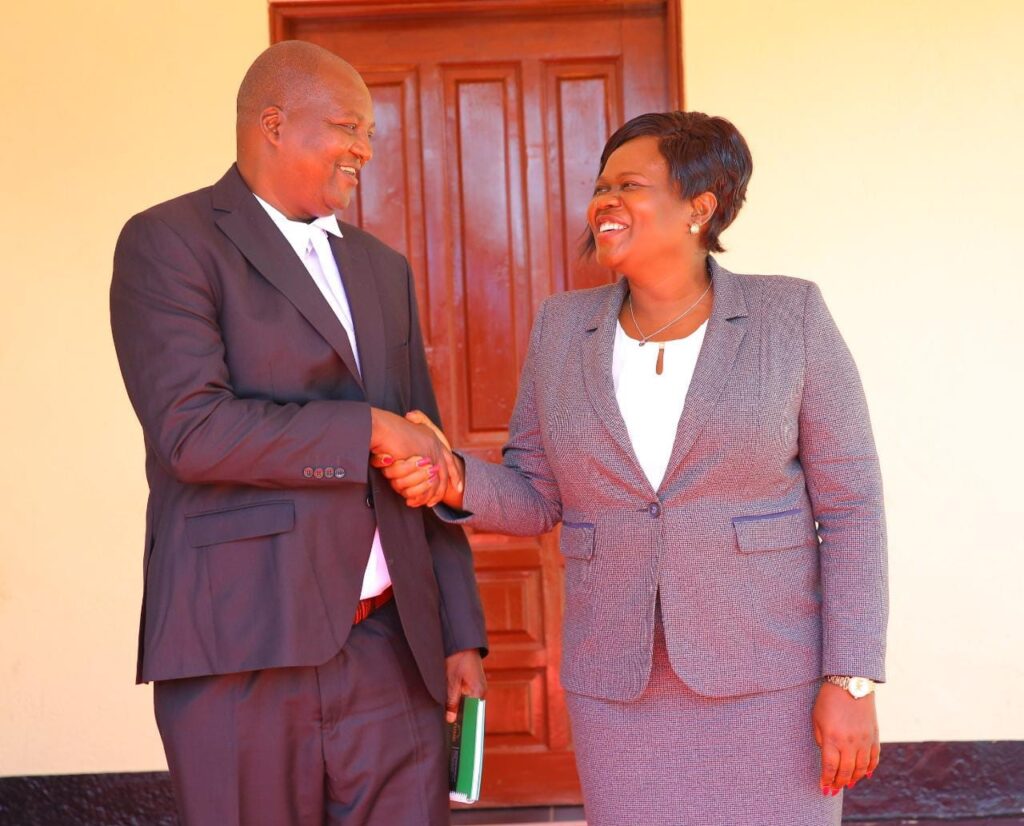 Former Homa Bay County Assembly speaker Julius Gaya shaking hands with his former boss governor Gladys Wanga.Photo/X