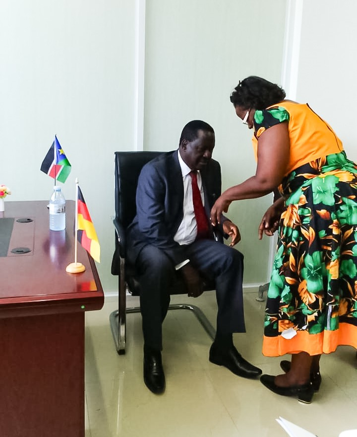 South Sudan’s Special Envoy to Germany, Ambassador Dr. Renish Omullo, with the late former Prime Minister Raila Odinga at her office in Germany. Photo/Maurice Alal