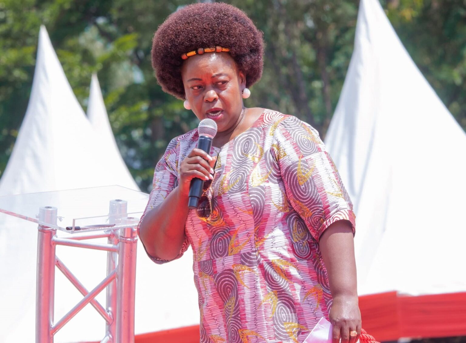 Suba North Member of Parliament Millie Odhiambo addressing mourners during the burial of slain blogger Albert Ojwang in Homa Bay County. Photo/Facebook